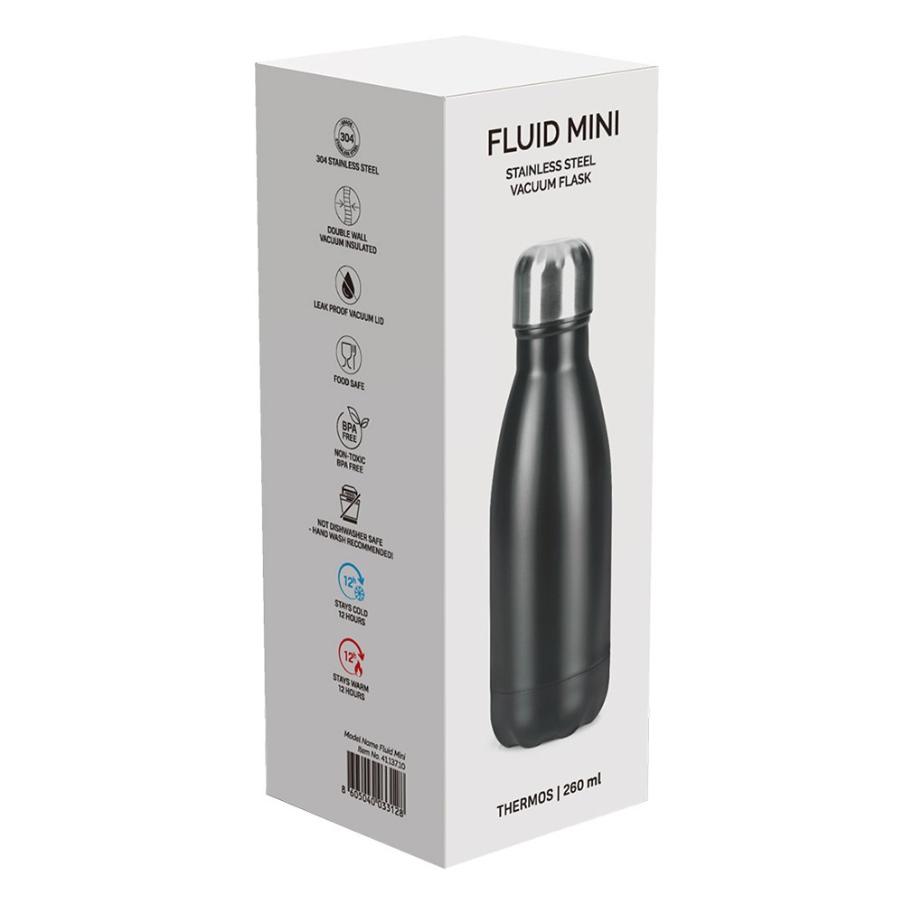 Kompaktan i elegantan FLUID MINI termos u crnoj boji idealan je pratilac za sve vaše dnevne aktivnosti. Sa zapreminom od 260ml, savršeno će sačuvati temperaturu vašeg omiljenog napitka.